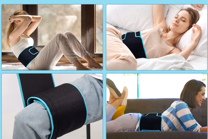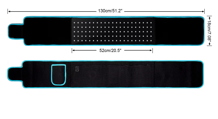La bande est souple, légère et ajustable, ce qui permet de l’attacher facilement autour de l’abdomen, du dos, ou d’autres zones douloureuses. Elle est alimentée par un câble électrique visible sur la photo, ce qui laisse supposer qu’elle doit être branchée pour fonctionner. La lumière rouge émise est bien visible à travers la surface interne de la bande, créant une sensation de chaleur douce lorsqu’elle est appliquée sur le corps.